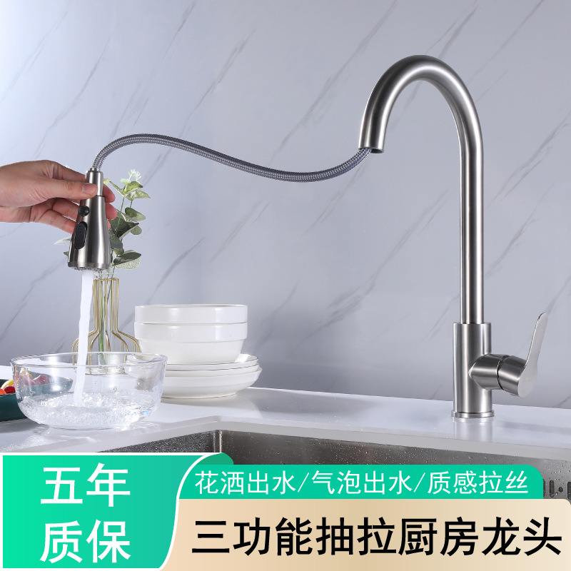Keran dapur 304 lintas batas, baja tahan karat disikat emas hitam, keran wastafel tarik ke luar, keran peregangan air panas dan dingin