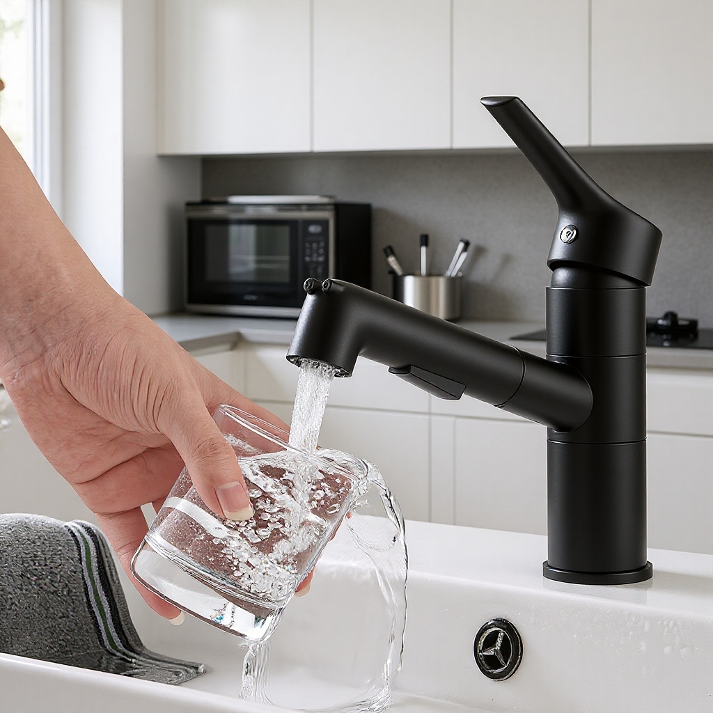 Keran hitam air dingin dan panas, keran hitam pull-out untuk rumah tangga, tembaga, keran cuci dapat ditarik berputar