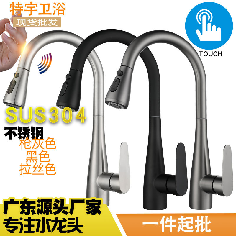 Pabrik lintas batas modern gaya Eropa induksi sederhana pistol SENTUH hitam abu-abu 304 baja tahan karat keran tarik dapur