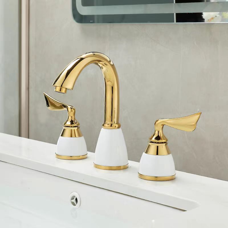 Keran Baskom Tiga Lubang Tembaga Penuh Lemari Kamar Mandi Baskom Emas Gaya Eropa Kamar Mandi Pita Dua Pas Panas dan Dingin