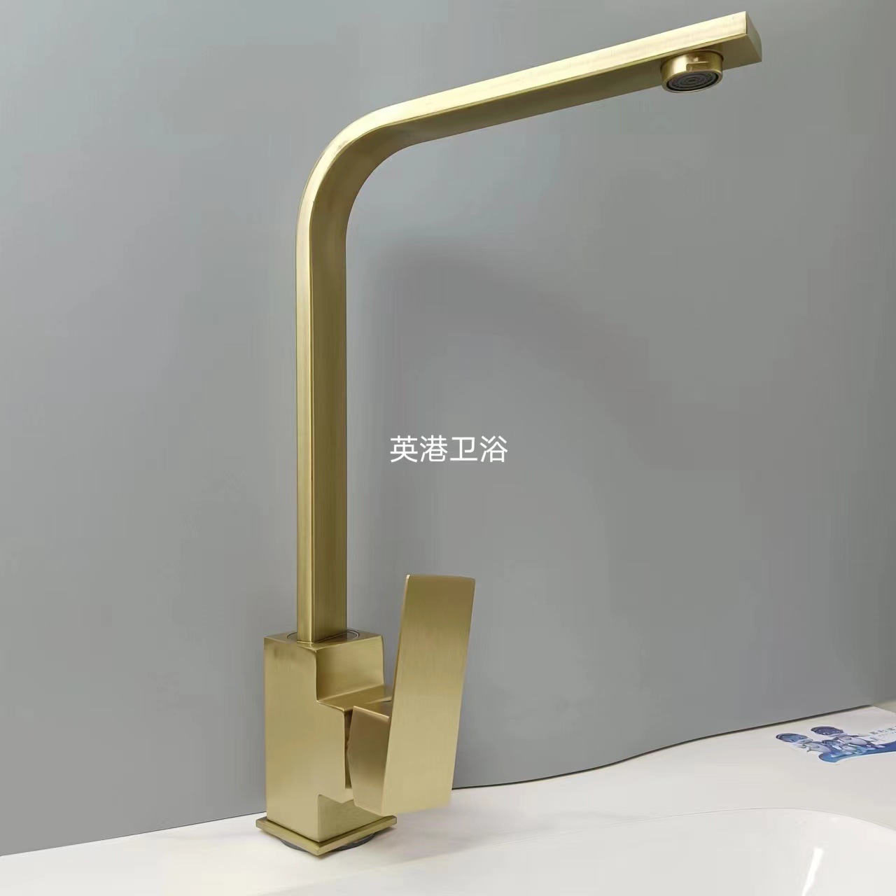 Keran dapur pipa datar persegi, kran dapur panas dan dingin disikat emas berputar tujuh karakter