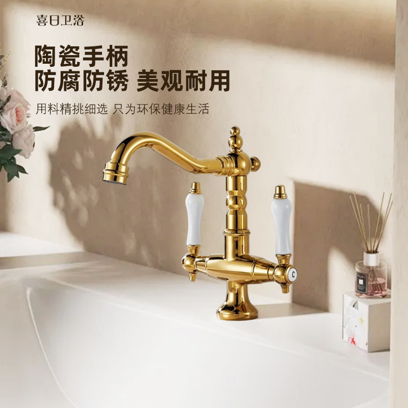 Keran kamar mandi gaya Eropa, keran pegangan ganda emas, keran kamar mandi, keran cuci keramik, keran lubang tunggal
