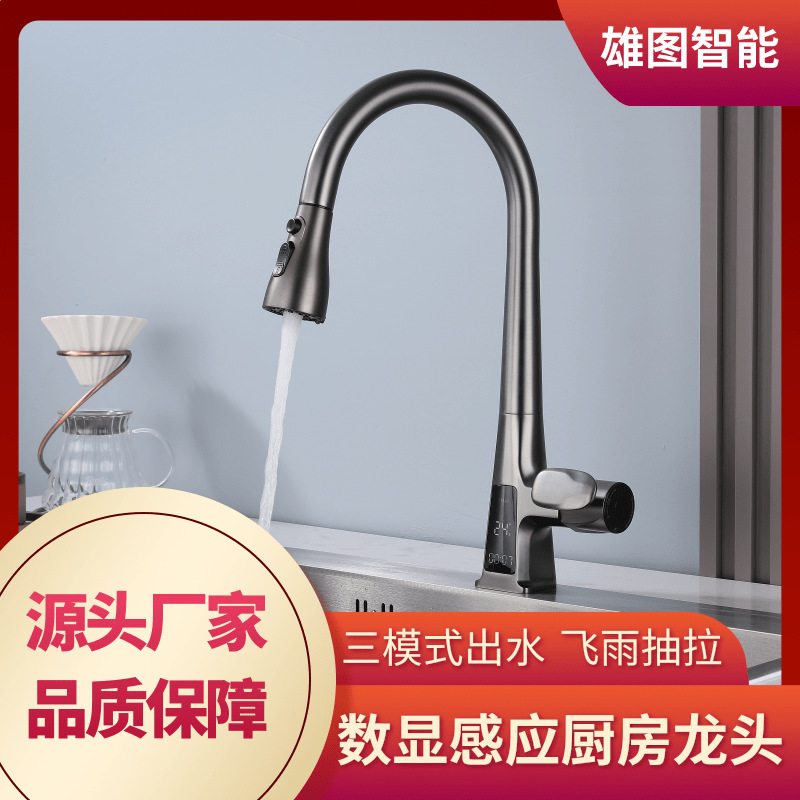 Pistol induksi tampilan Digital abu-abu dapur, keran pull-out bak sayur panas dan dingin terisi daya super dengan mode keran outlet