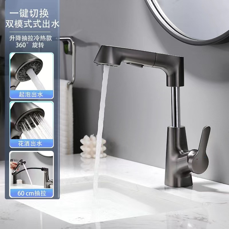 Pabrik Guangdong kabinet kamar mandi punggung tinggi keran baskom tarik keran tembaga panas dan dingin konter cuci mulut keran tersembunyi