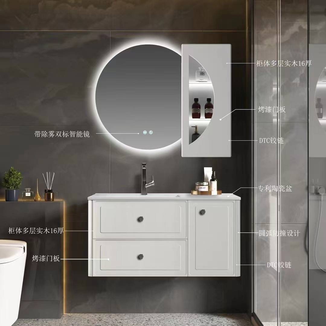 Hot cream setelan kabinet cermin pintar meja cuci gaya multi-layer kabinet kamar mandi kayu solid cermin bulat baskom keramik terintegrasi
