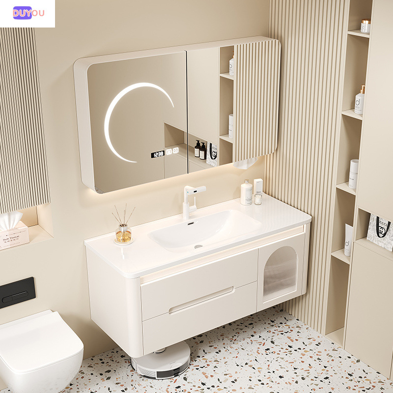 Lemari kamar mandi keramik tanpa kelim, kombinasi peralatan mencuci tangan dan wajah untuk kamar mandi cuci kamar mandi lapisan ganda plat batu cerdas