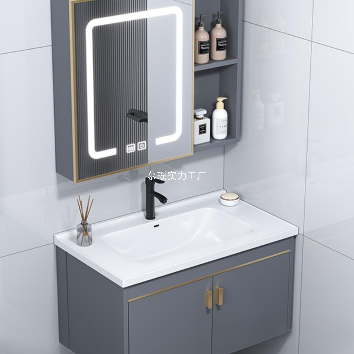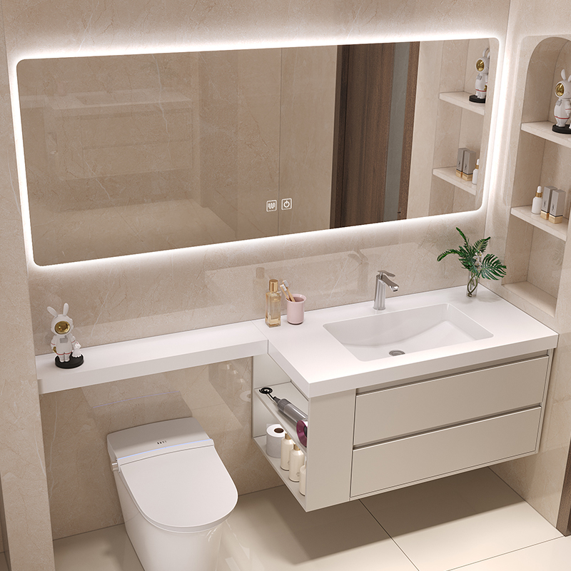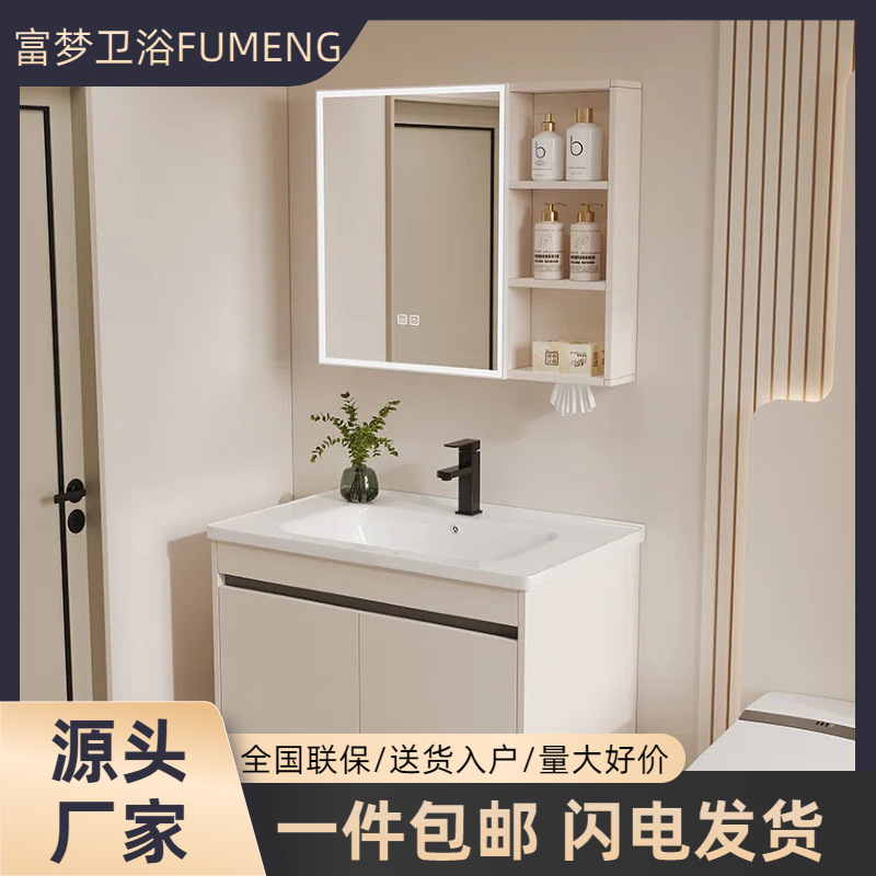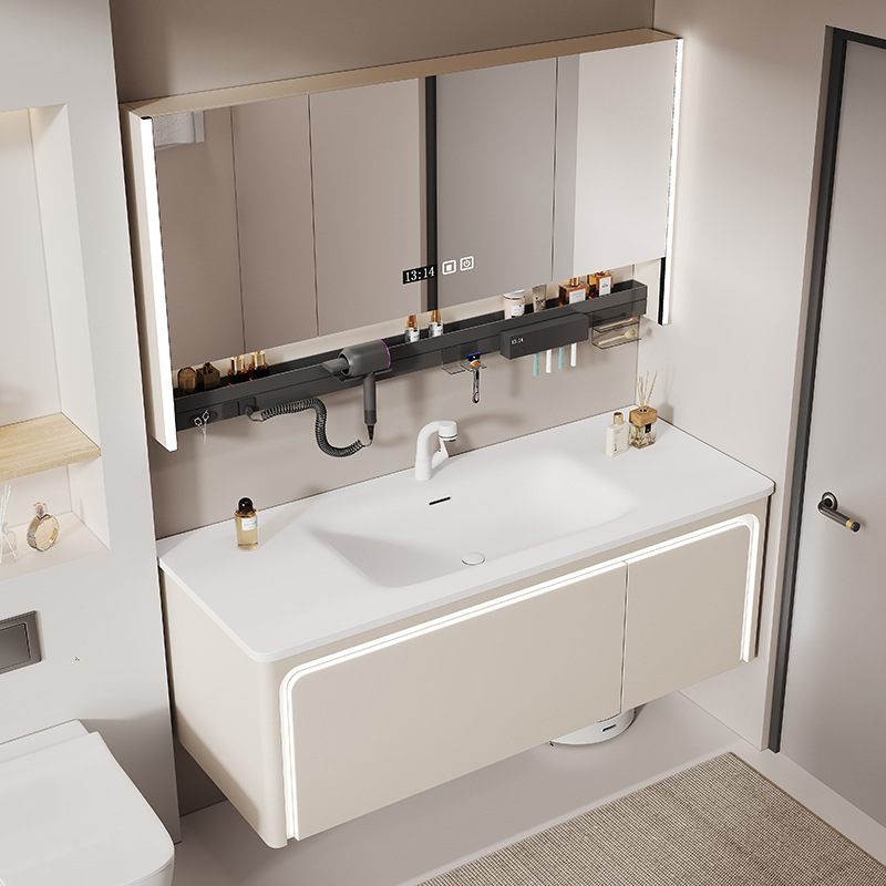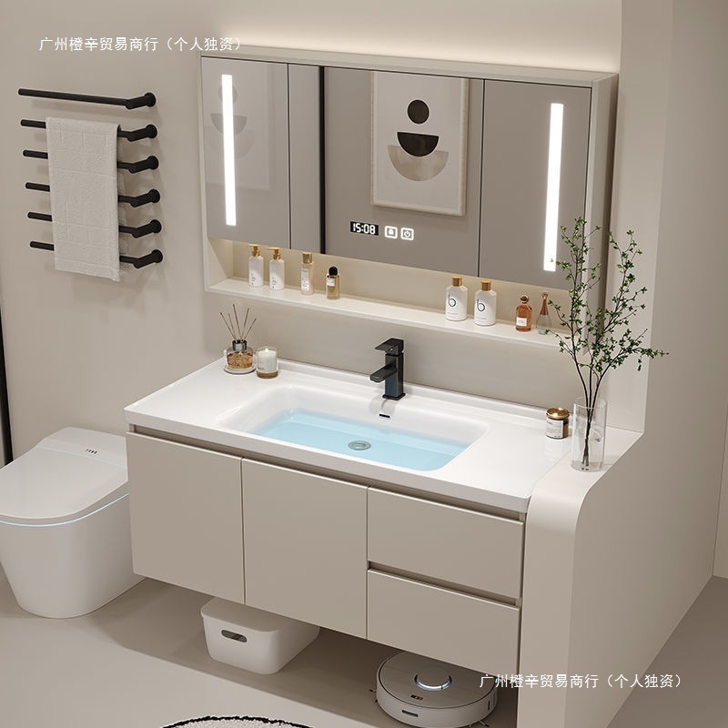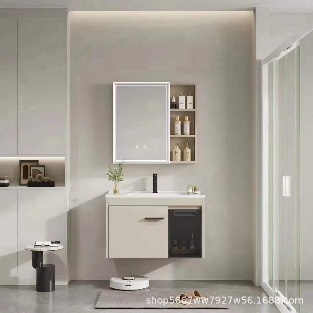 Kabinet kamar mandi, wastafel terintegrasi plat batu, kombinasi aluminium sarang lebah cermin pintar tebal sederhana dengan gaya krim kabinet samping