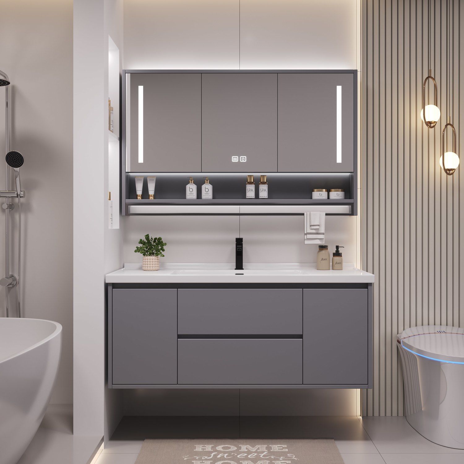 Lemari kamar mandi kombinasi kabinet kamar mandi, lebar 40cm, kedalaman bak keramik terintegrasi, Kabinet cermin pintar tiga pintu, dudukan penyimpanan