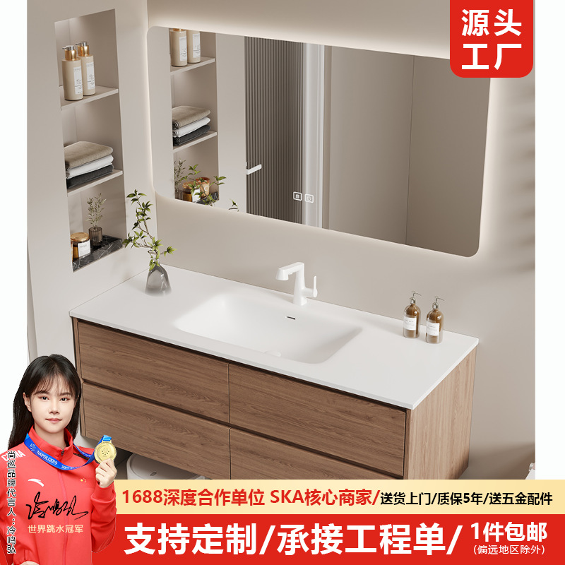 Pelat batu keramik sambungan mulus terintegrasi baskom kayu solid kabinet kamar mandi kombinasi rumah tangga tangan wastafel kabinet cermin pintar