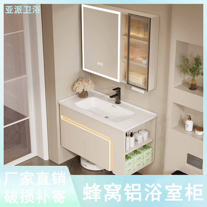 Kamar Mandi Aluminium Honeycomb Gaya Krim Kombinasi Keramik Baskom Satu Tubuh dengan Sisi Sisi Toilet Lemari Laci Lampu Suasana Baskom Cuci Wajah