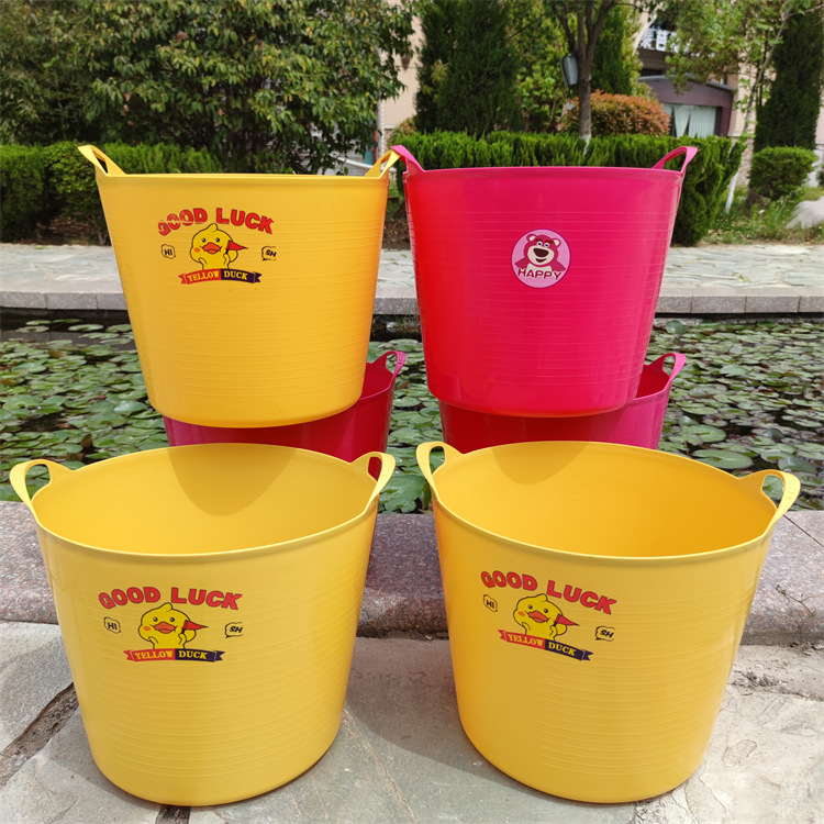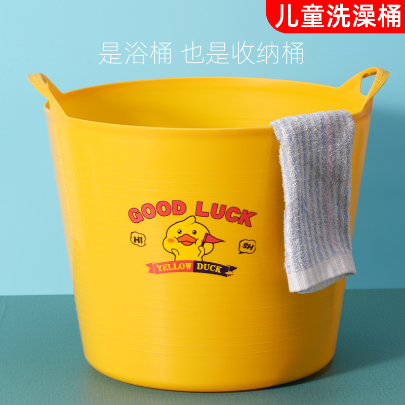 Ember mandi plastik portabel anak-anak, keranjang cucian kamar mandi, ember mandi beruang stroberi kuning kecil, ember penyimpanan anak bebek