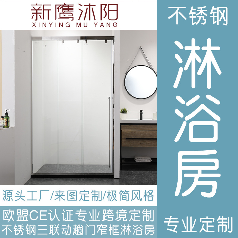 Pintu kamar mandi, bingkai stainless steel lintas batas satu garis tiga pintu geser ruang mandi pemisah kaca basah dan kering pintu kamar mandi