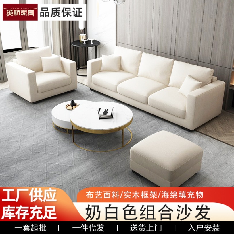 Sofa Ruang Tamu Seni Kain Gaya Krim Sofa Baris Lurus Kain Flanel Kain Bantalan Kapas