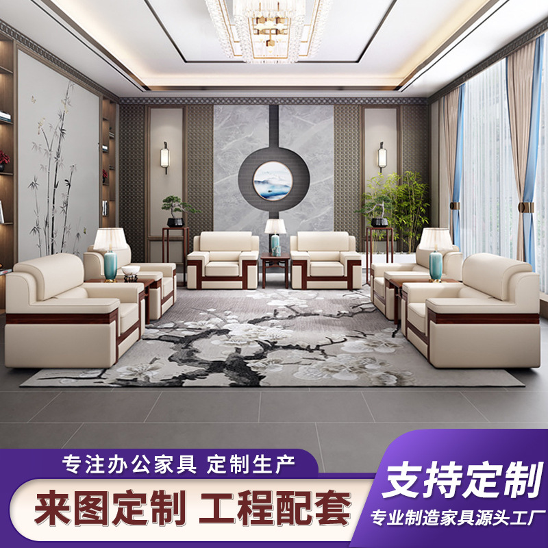 Sofa Kantor Kulit Asli Set Meja Kopi Bisnis Penerimaan Tamu Kantor Gaya Tiongkok Model Baru Tempat Tiga Orang Minimalis Modern