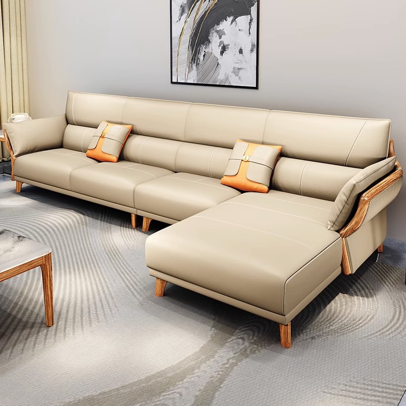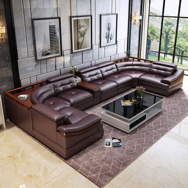 Sofa kulit berbentuk U sofa sudut kayu solid Tiongkok baru ruang tamu besar dan kecil sofa kulit Foshan kelas atas villa