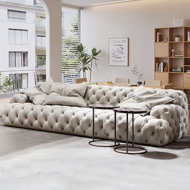Sofa lurus gaya krim Nordic, gesper tarik sofa Italia sederhana kreatif ruang tamu desainer apartemen kecil kain sofa baris lurus