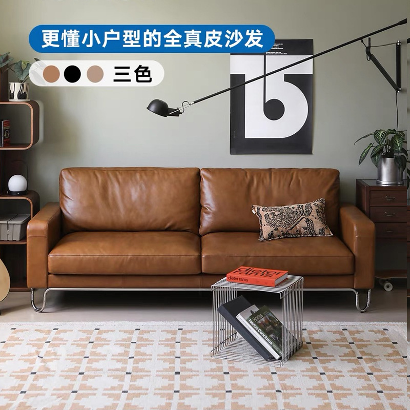 Sofa Kulit Asli Retro Skandinavia Tipe Unit Kecil Ruang Tamu Gaya Kuno Sedang Baris Laris Tas Haus Lapisan Kepala Kulit Sapi Hitam Sofa U