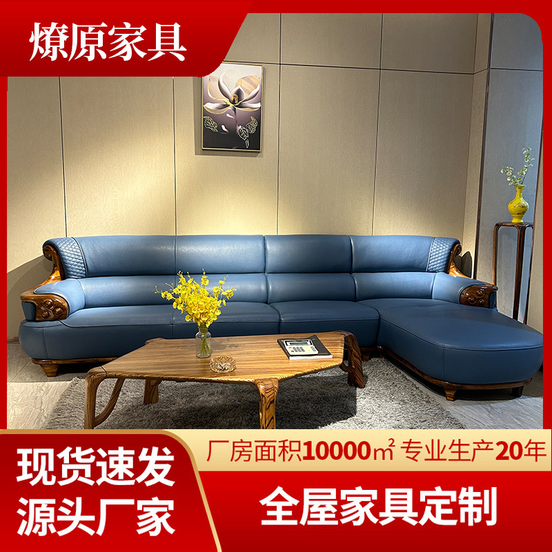 Sofa kayu padat gaya China, Modern minimalis baru lapisan pertama kulit sapi ruang tamu sofa kayu hitam sudut