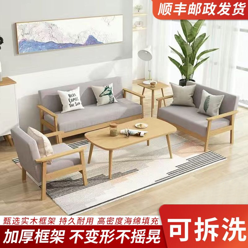 Sofa Kayu Solid Kombinasi Meja Kopi Kursi Kantor Tiga Orang Kain Sederhana Modern Ruang Tamu Apartemen Kecil Dua Orang