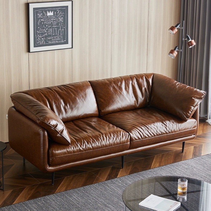 HUG sofa kulit lilin minyak antik sofa baris lurus tiga tempat duduk apartemen kecil ruang tamu gaya kuno turun