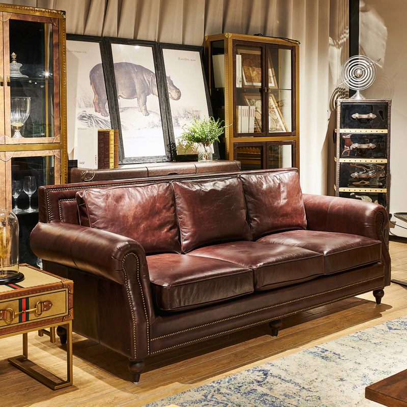 Sofa kulit gaya Eropa dan Amerika antik antik lilin minyak antik lapisan pertama kulit sapi lurus ke bawah ruang tamu sofa keling