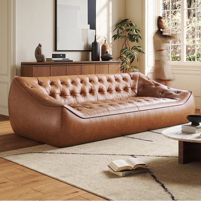 Sofa kulit penuh untuk ruang tamu sofa sofa baris lurus apartemen kecil retro Perancis lilin minyak kelas atas gaya kuno
