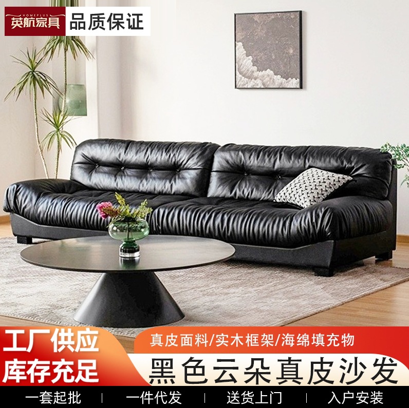 Sofa kulit Cloud lapisan pertama kulit sapi Italia minimalis hitam vintage Villa modern baris lurus kulit sapi tarik gesper sofa