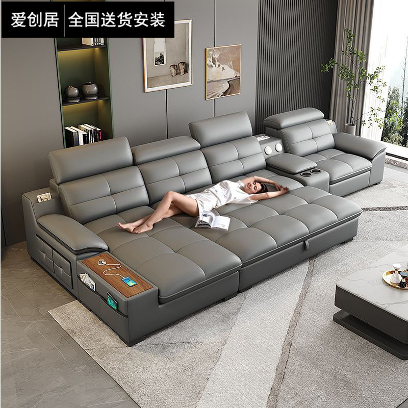 Tempat tidur sofa listrik multifungsi, penyimpanan kecil apartemen Kulit Kombinasi Italia ruang tamu modern baris lurus dapat ditarik