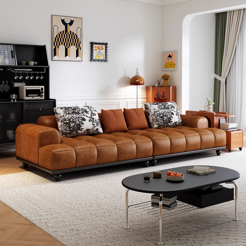 Sofa Seni Kulit Telinga Gajah Retro Gaya Pertengahan Gaya Prancis Sofa Kulit Asli Baris Laris Ruang Tamu Unit Kecil Sederhana Modern