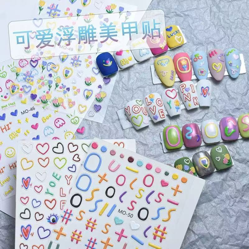 美甲多巴胺浮雕贴纸线条圆圈郁金香字母爱心指甲立体日系背胶可爱