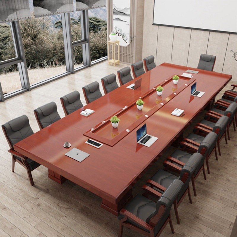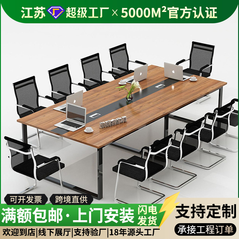 Meja konferensi besar cat meja panjang, Stiker modern sederhana kayu solid strip kulit banyak orang meja negosiasi dan kursi kombinasi gratis pengiriman