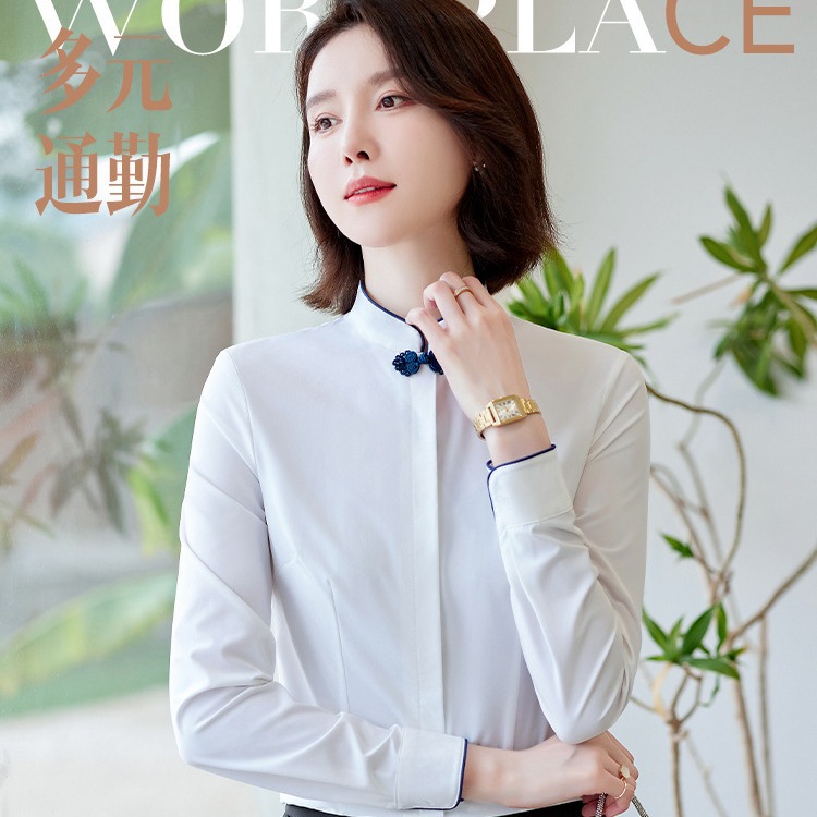 Kemeja kerja wanita lengan panjang musim semi & musim gugur seragam staf layanan resepsionis meja depan hotel kemeja gaya Cina yang elegan dan profesional