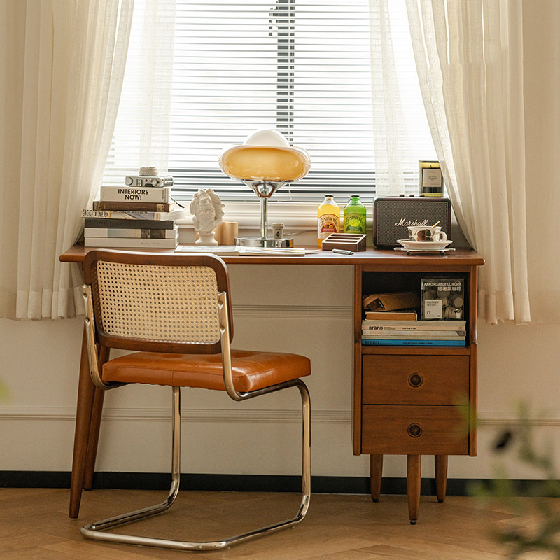 Meja Kayu Solid Retro Gaya Pertengahan Meja Bentuk Persegi Panjang Tunggal Kombinasi Dua Orang dengan Rak Buku Meja Belajar Kamar Tidur Gaya Prancis