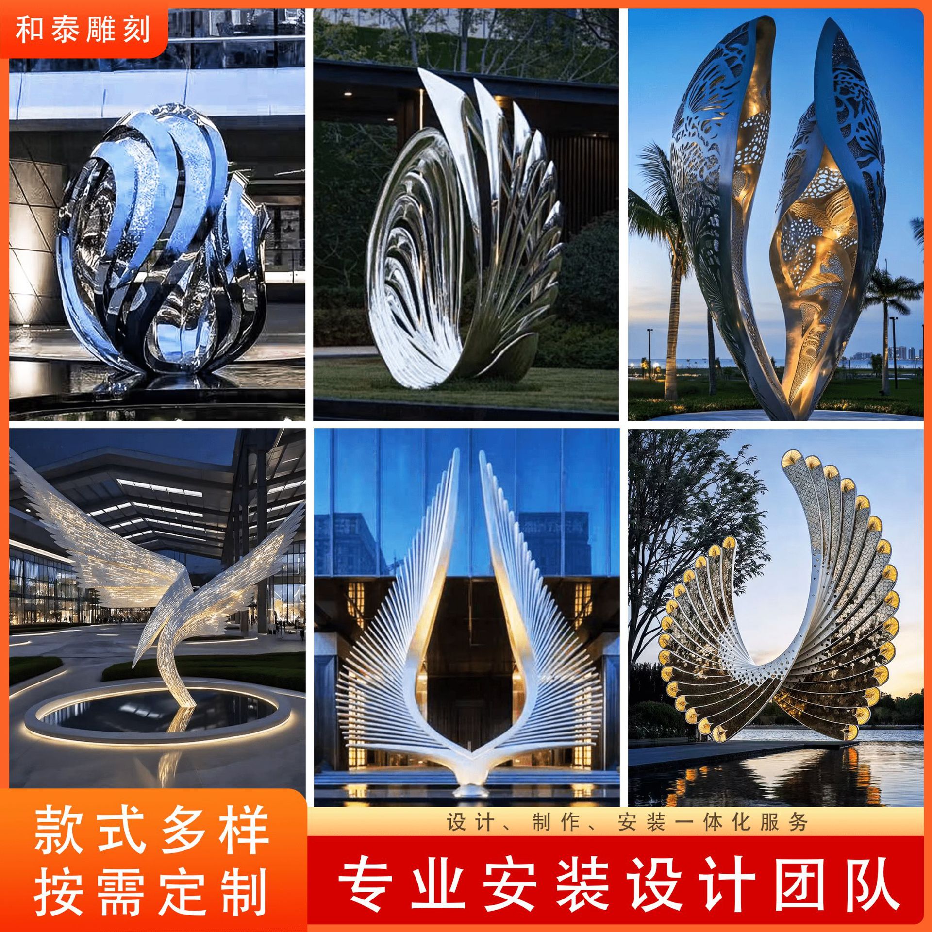 Patung bentuk khusus abstrak baja tahan karat dekorasi departemen penjualan real estate luar ruangan lanskap sayap bercahaya persegi luar ruangan