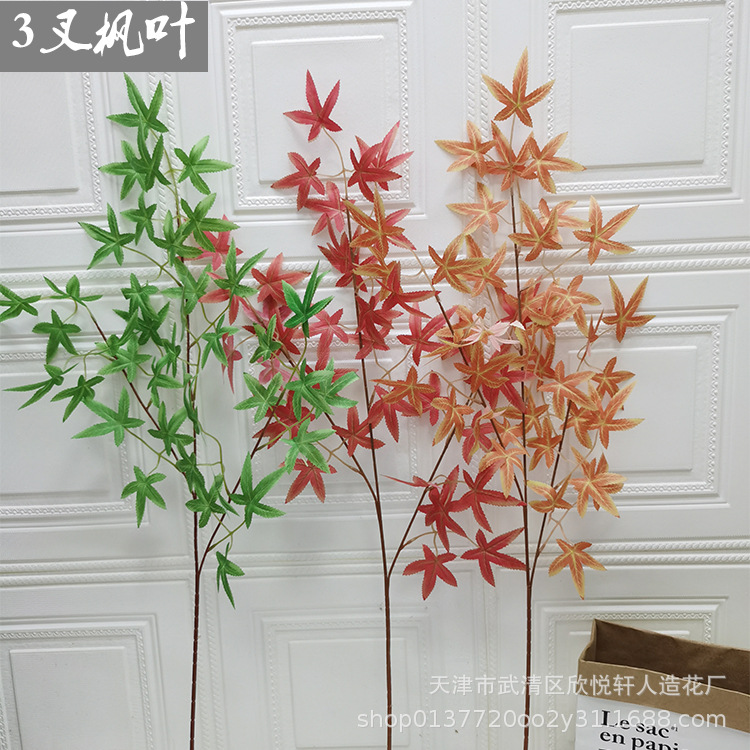 Dekorasi buatan daun maple buatan, hiasan teknik taman daun Maple hijau daun maple tiga garpu layar sutra