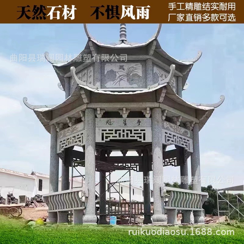 Paviliun ukiran batu heksagonal gaya Cina, paviliun batu halaman vila lanskap paviliun, taman luar ruangan koridor