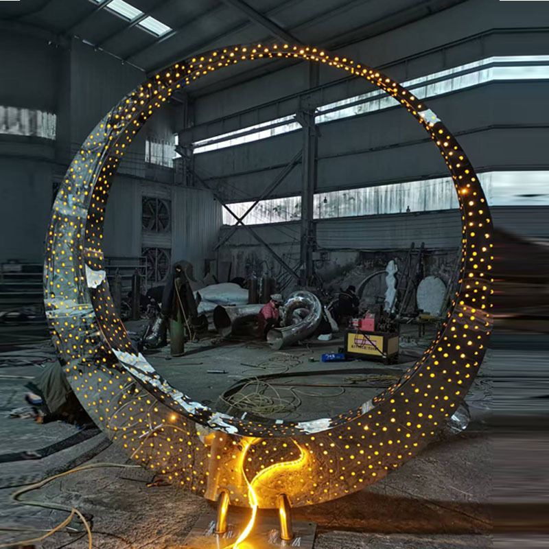 Stainless Steel Bulan Patung Berongga Cahaya Pemandangan Air Abstrak Lingkaran Dekorasi Outdoor Departemen Penjualan Real Estat Taman