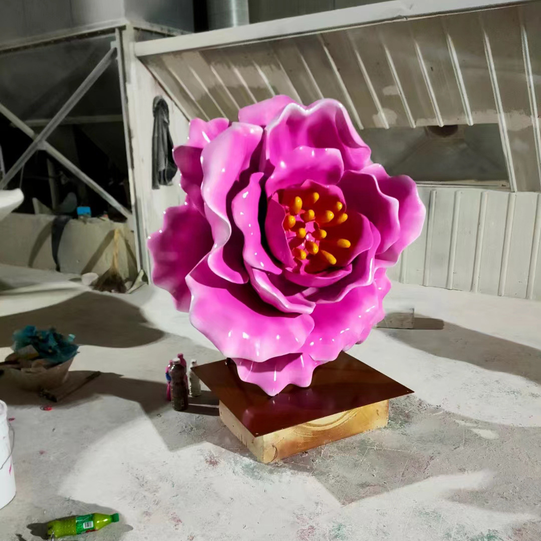 Patung bunga FRP besar luar ruangan pemandangan indah jaring rumput merah punch-in simulasi foto dekorasi peony