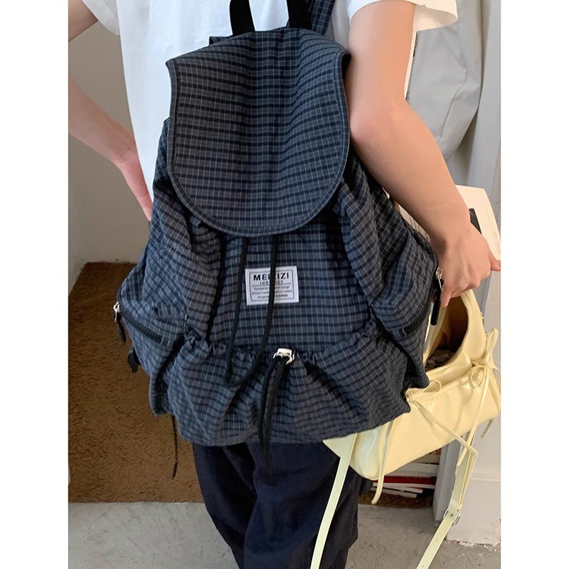 Tas Kanvas Nilon Kotak-kotak Tas Ransel Versi Korea Modis Trendi Model Baru 2025 Wanita Tas Komputer Kapasitas Besar Kasual