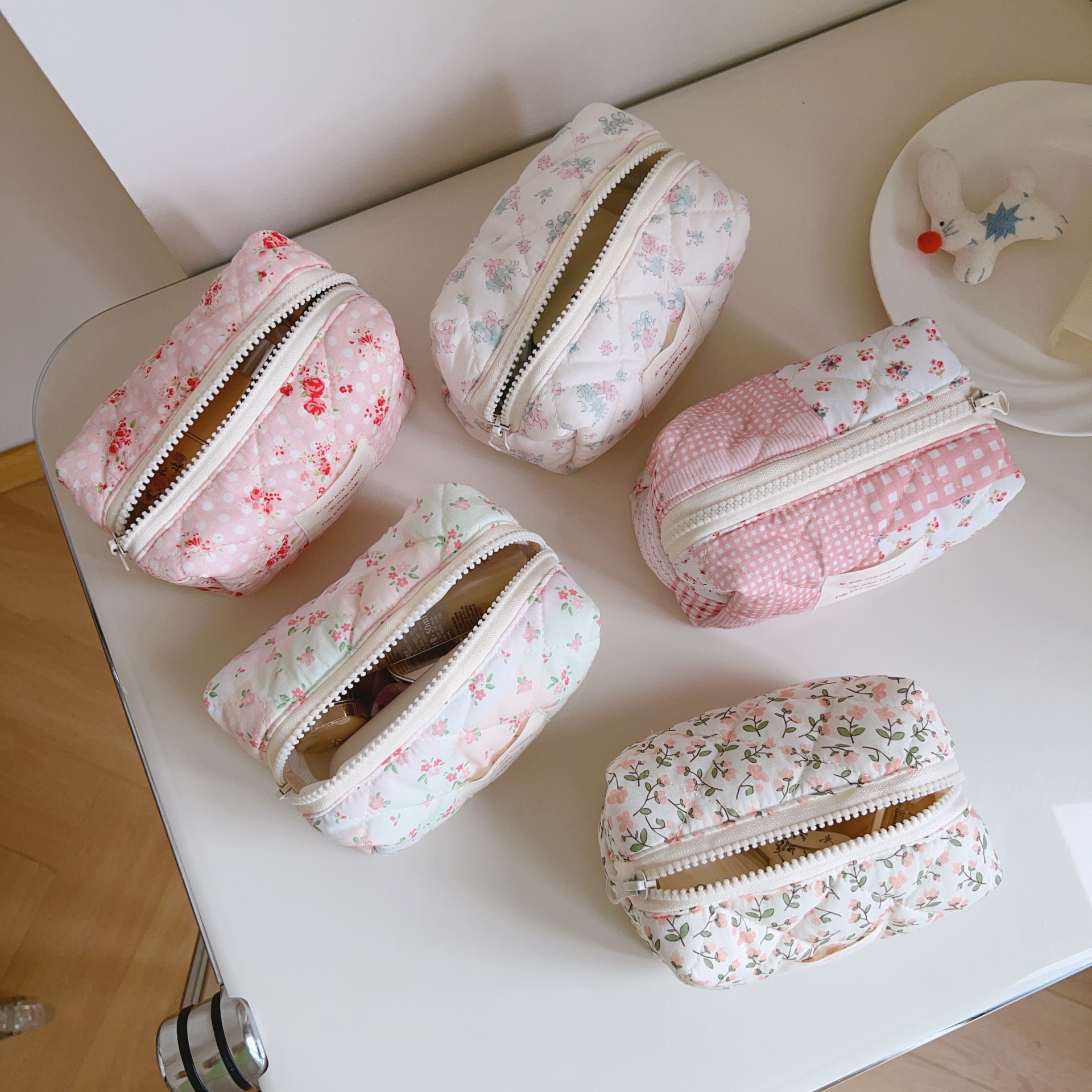 [Tas Su Xibu] Tas Perahu Kapas Berlapis Bunga Warna Merah Muda Tas Kosmetik Tas Tata Rias Tas Penyimpanan