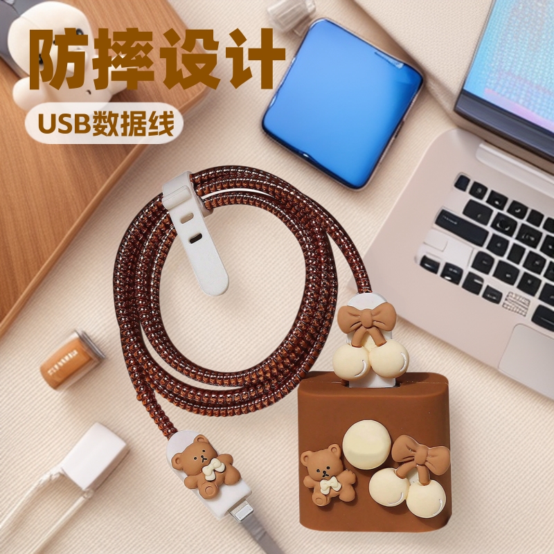 Pelindung kabel data beruang kopi lucu bergaya kartun, pengisi daya cepat Apple 15 20w anti-pecah