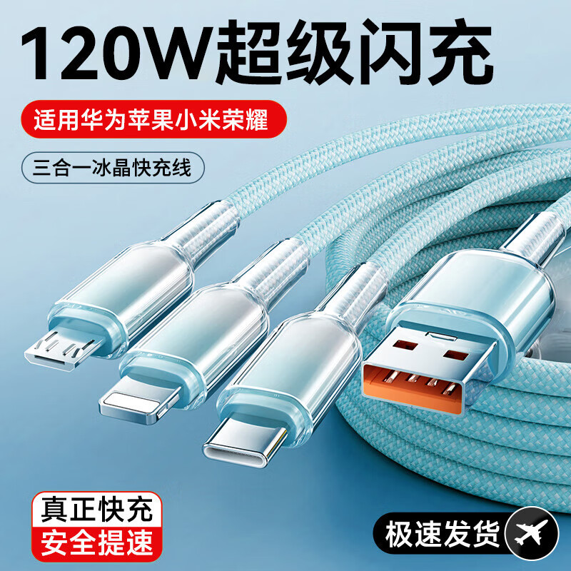 Kabel Data Kristal Es 3-in-1 Cocok untuk Apple Android Type C Satu Strip Tiga 120W Kabel Charger Tenun Cepat