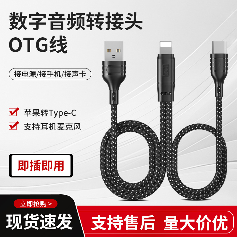 Kabel OTG lintas batas yang cocok untuk ponsel Apple dan Android untuk koneksi siaran langsung, kartu suara, mixer, audio, pengisian daya, dan transfer data.