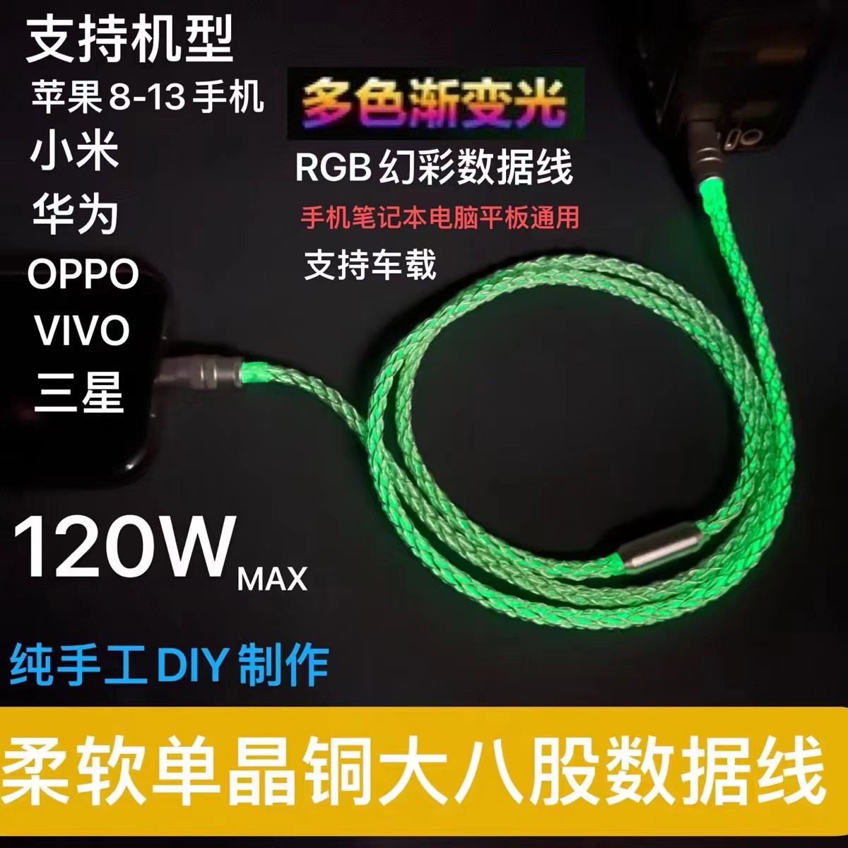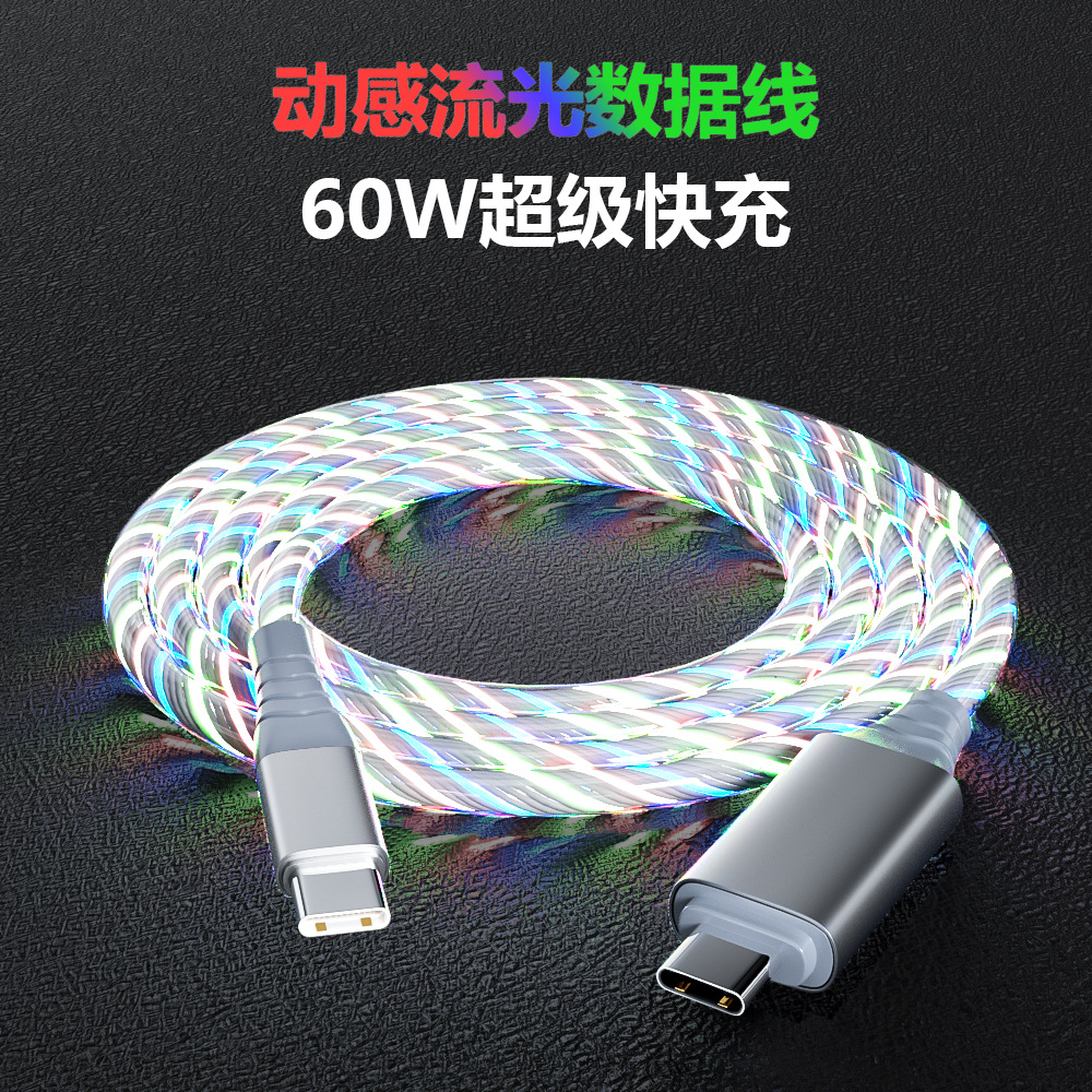 RGB kawat lapis perak Delapan untai bercahaya, kabel data isi daya Cepat 30W warna gradien untuk USB Apple 15