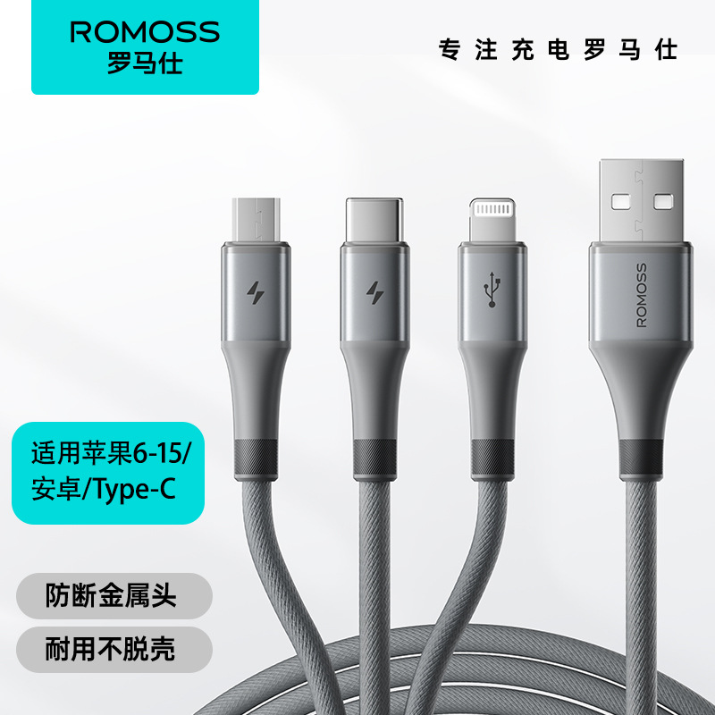 Kabel Data 3-in-1 Romas 6A100W Pengisian Cepat Cocok untuk Apple Huawei Android Satu Trailer Tiga Kabel Pengisian Mobil