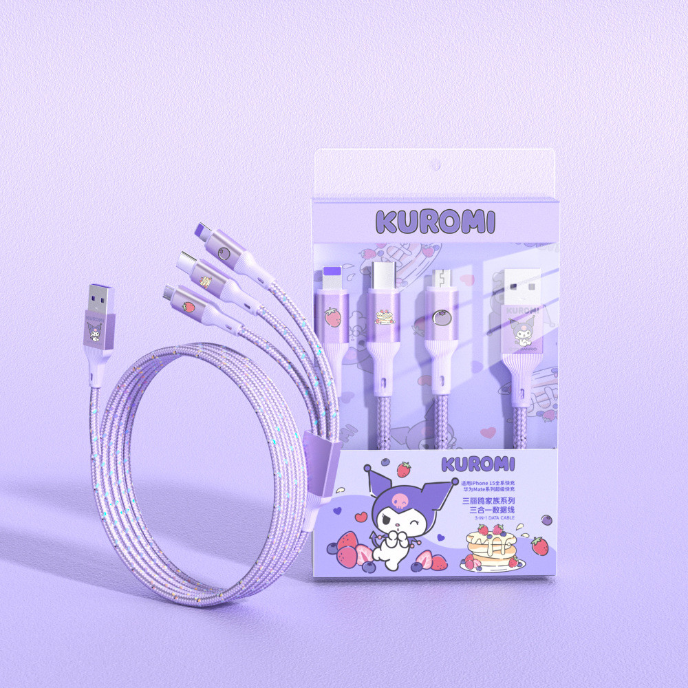 Sanrio 66W kabel data pengisi daya super cepat kabel kilat satu per tiga kabel pengisi daya cocok untuk Apple typec pabrik grosir