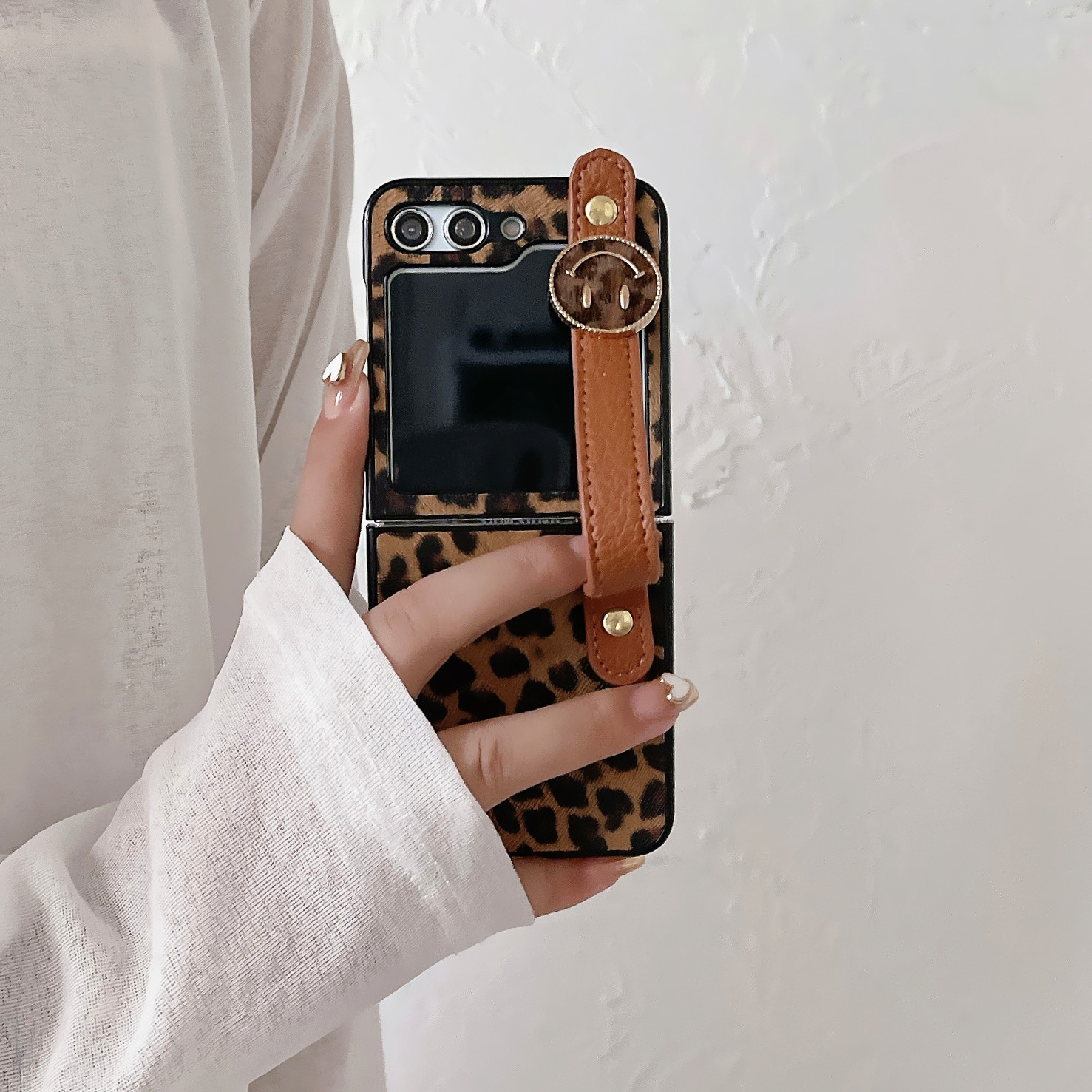 Casing Ponsel Lipat Samsung GalaxyZFlip6 Bermotif Leopard Warna Coklat Retro Zflip3/4/5 Gelang Smiley
