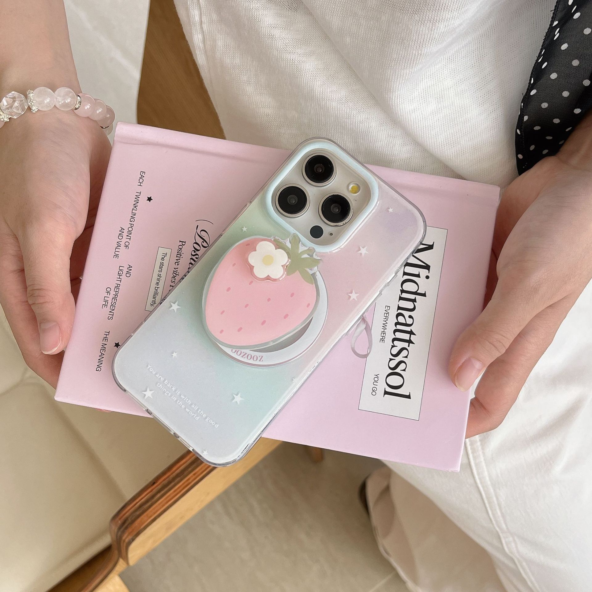 Casing Ponsel Penyangga Stroberi Bintang Gradien Casing Ponsel Cocok untuk Apple 15Pro Sarung Pelindung Magnetik iPhone16