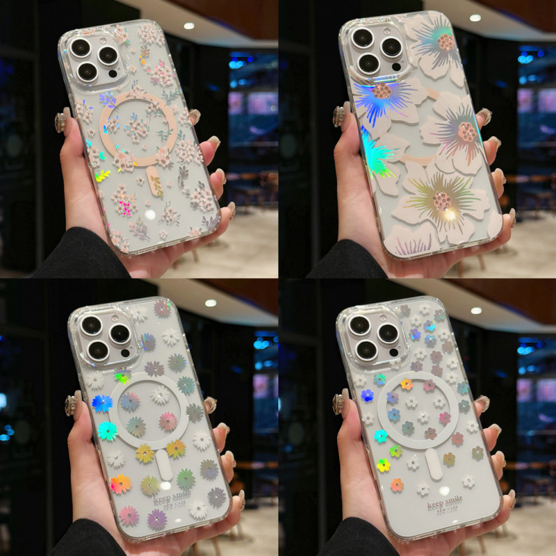 Casing Ponsel Pengisap Magnetik iPhone16 Cocok untuk Bunga Laser Warna Warna-warni Casing Pelindung Apple Daisy 15ProMax Transparan