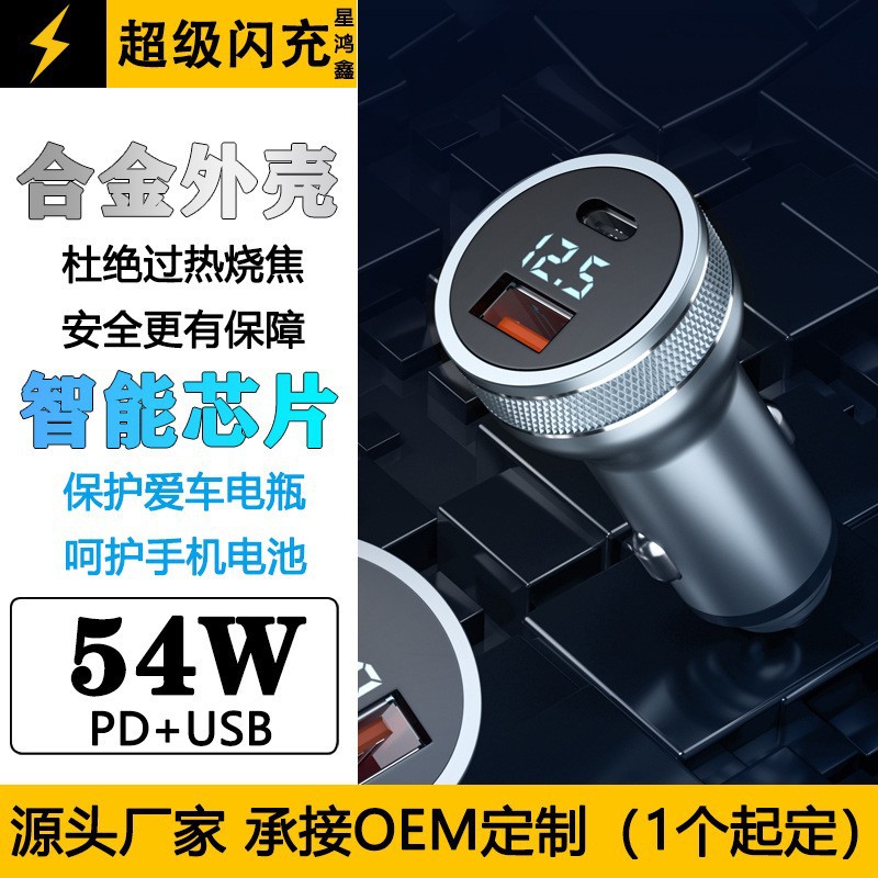 Pengisi daya mobil tampilan digital paduan aluminium populer lintas batas 54W pengisi daya super cepat PD36W pengisi daya mobil logam pengisi daya mobil port ganda